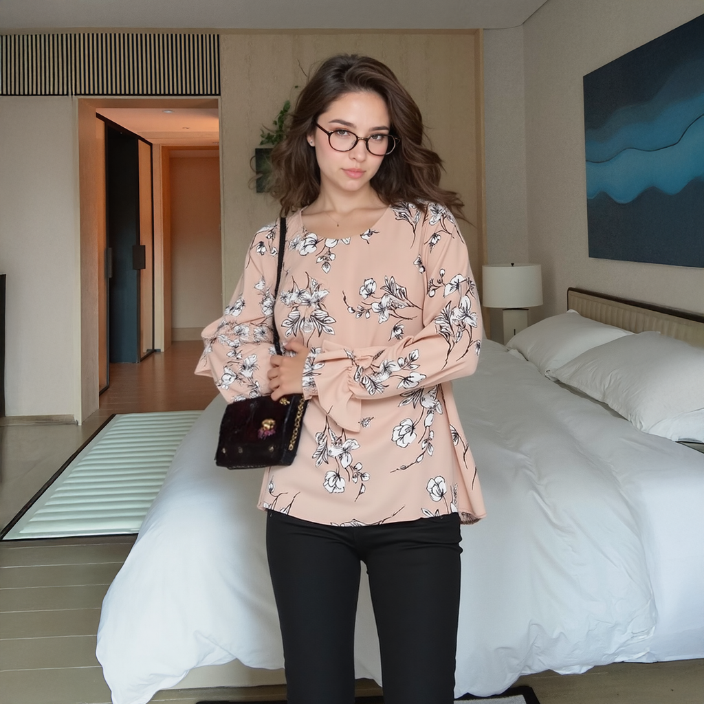 Pleione Women's Round Neck Smocked Ruffle Cuff Top by Shop at Konus