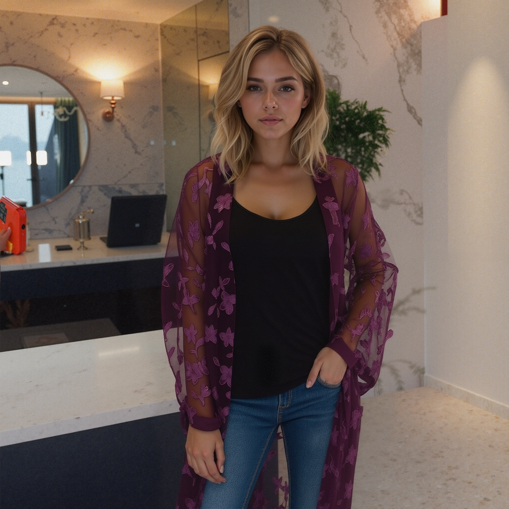 This cardigan features a sheer, embossed floral print with an open front design, self-tie belt, drop shoulder style, and convenient side pockets. Clip satin floral.